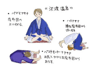 家庭的な和風旅館が立ち並ぶ沢渡温泉には洋室はなさそうです。和室と洋室、どちらがヨガに向いているかといえば、それは和室です。畳の上ならマットも必要なくすぐにポーズをとれます。今回は和室に必ずある座布団を使ってヨガをしました。